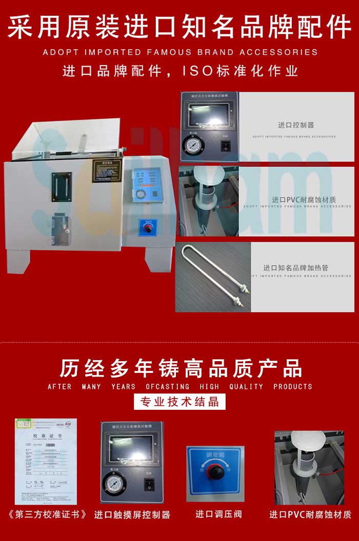 觸摸屏鹽霧腐蝕試驗(yàn)箱采用整機(jī)PVC板制,內(nèi)部采用先進(jìn)環(huán)帶產(chǎn)立體補(bǔ)強(qiáng)技術(shù)、結(jié)構(gòu)強(qiáng)實(shí),永不變形,并耐酸堿、耐高溫永不老化,適用於鹽霧、醋酸銅等各種測(cè)試規(guī)格